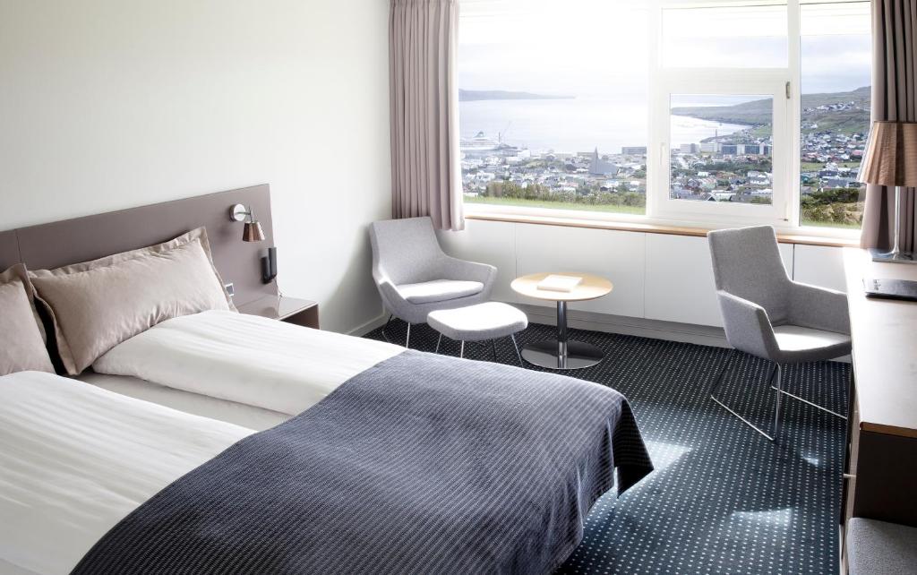 Ett myckt fint hotell som smälter in i det vackra landskapet tack vare den fantastiske arkitekturen. Man ligger ovanför huvudstaden Torshavn så man har utsikt över både staden och havet. Det finns promenadstråk ner till stan som ligger ca 2 km bort. På hotellet finns en fin restaurang och spa avdelning.