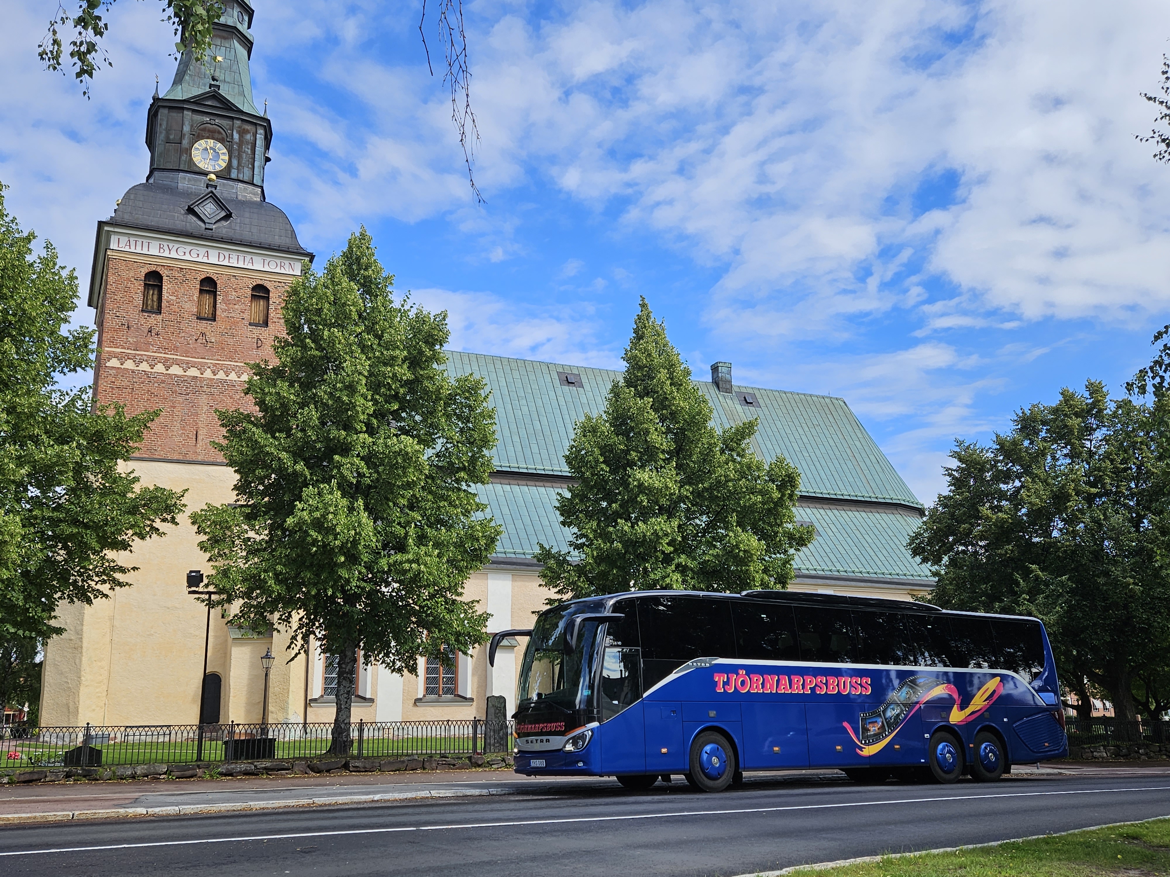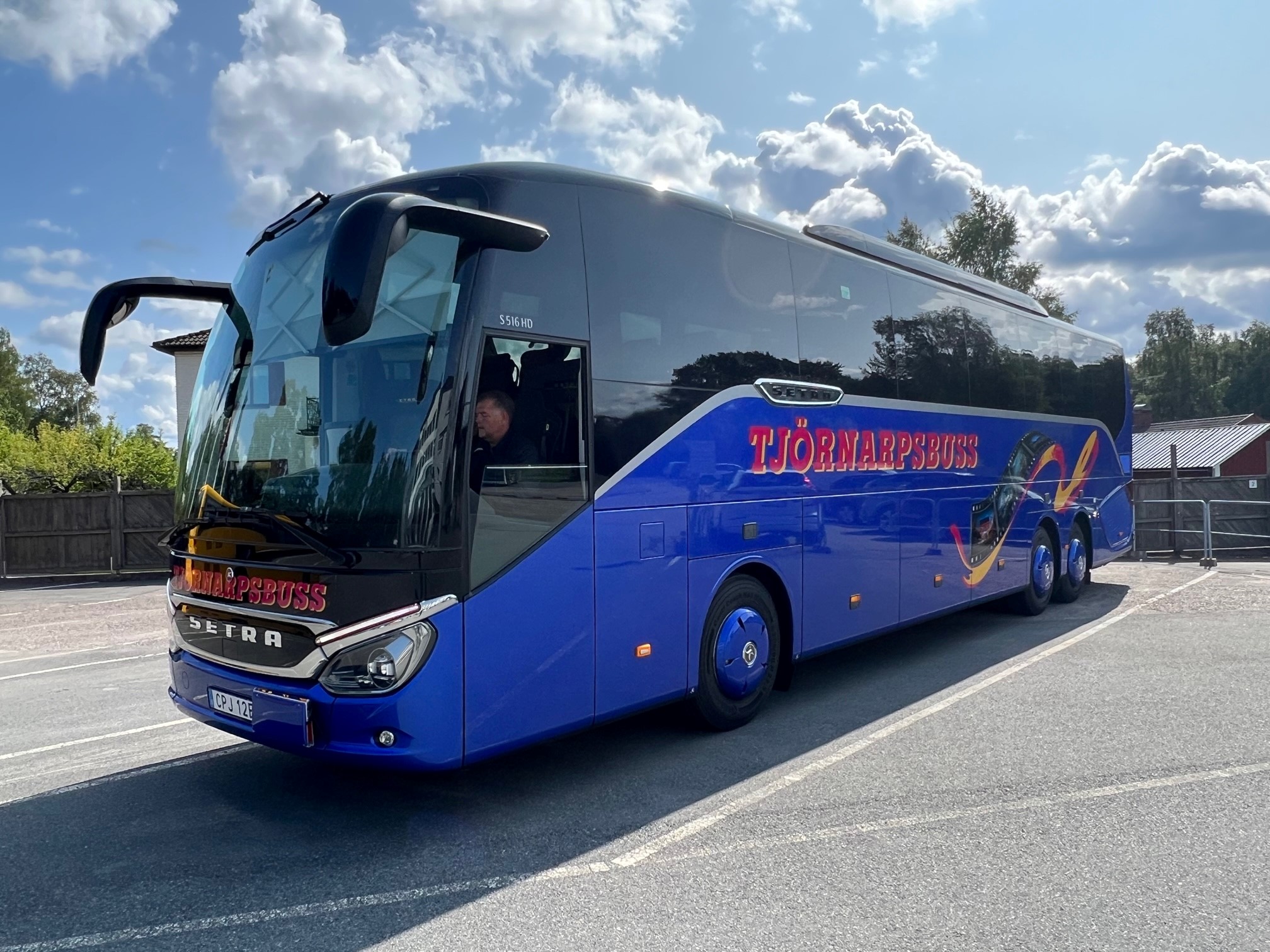 Setra 516 HD: Antal sittplatser: 48 Information: Vår nyaste turistbuss med extra stort benutrymme. Komfortabla säten som är skjutbara i sidled med fällbar rygg samt fotstöd. Kaffekokare, kylskåp och toalett. Dragkrok till släp. 220 V. Bluetooth.