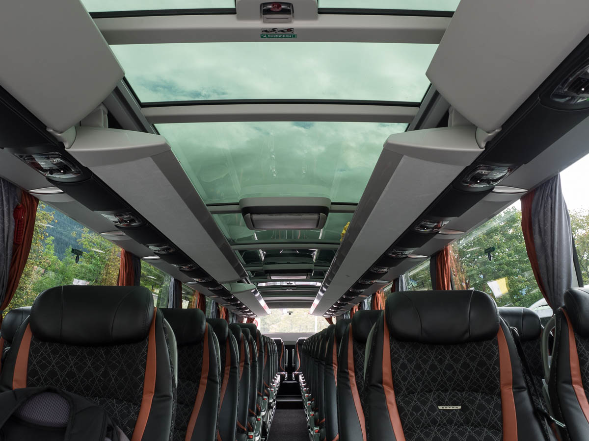 Setra 516 HDH: Antal sittplatser: 50 Information: Turistbuss med panoramatak och extra stort benutrymme. Komfortabla säten som är skjutbara i sidled och med fällbar rygg och fotstöd. Kaffekokare, kylskåp och toalett. 220 V. Dragkrok till släp.